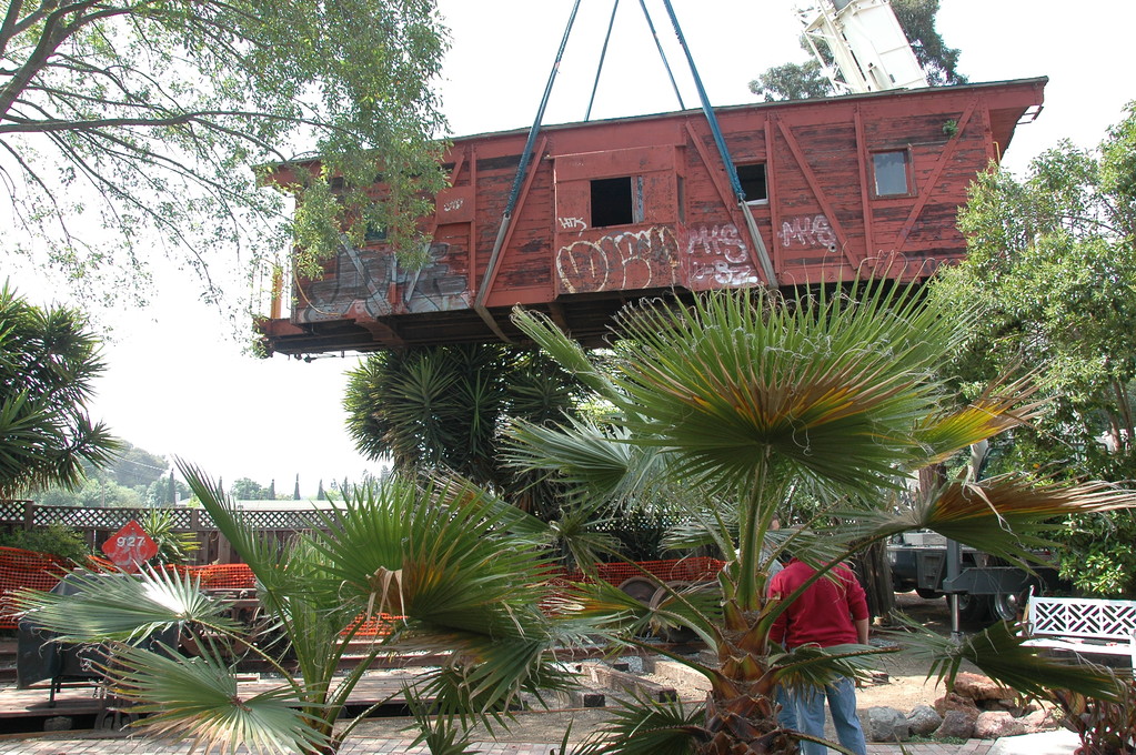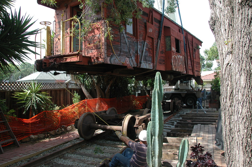 WP668, our 91-year-old caboose, moved to our backyard today after over a year in storage. We all arrived at 7:30 a.m. to start the job. South Bay Crane & Rigging (408-244-0414, Los Gatos, CA) lifted the 1916 historic railroad car by crane and loaded her onto a truck. At 9 a.m., they drove WP668 three blocks to our house.