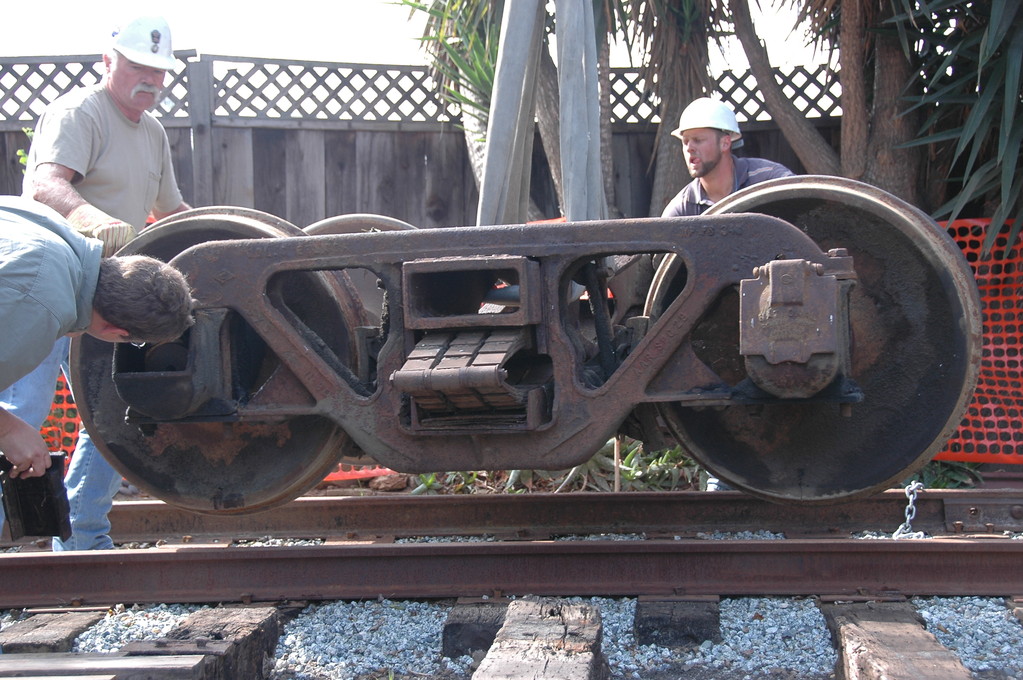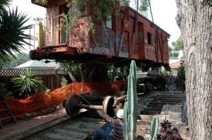 The first job was to get the crane into the driveway that runs along our back fence. One of the gateposts and some tree limbs came down but Julie, the crane operator, did make it fit. Then, the crane turned one of the caboose’s truck and wheel sets end for end (we had rolled it in backwards when we moved it out of storage last year). Finally, the crane lifted the 18-ton WP668 body off the lowboy flatbed, over the trees (some more limbs damaged but nothing unexpected), and onto the wheels. Lance, the rigger, went up and over the fence and back to keep the pulling rope stretched in the right direction so that Dennis could direct Julie in how to lower the caboose down with the least damage to surrounding trees. Our friend Chuck Cottam (who designs and installs koi ponds) and my husband John acted as backup riggers. Chuck also wielded the tree saw as needed.