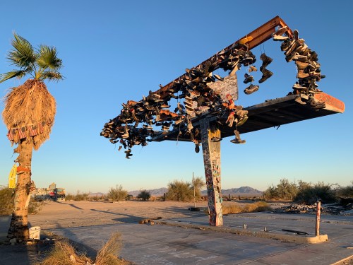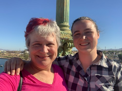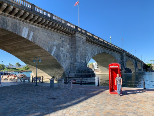 Yesterday, Jessica and I we drove to Joshua Tree National Park and walked the Hidden Valley Nature Trail which is full of yuccas, cactus, and piles of vast granite boulders. Today, Jessica and I started off with a walk across London Bridge over Lake Havasu, Arizona. The 1830s structure over the River Thames was dismantled and rebuilt in Arizona in 1971. We then drove to the superb Desert Botanical Garden in Phoenix where the temperature was 107 degrees Fahrenheit. Tomorrow, we go to the Petrified Forest National Park and Santa Fe. In long stretches of desert driving, we have seen shoe-laden ruins, lizards, birds, chipmunks, rabbits, squirrels (and one big snake) but no roadrunners or tortoises yet. Still hoping to see a roadrunner…