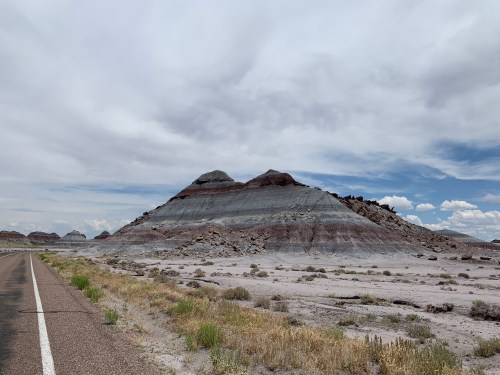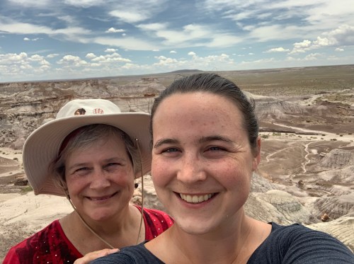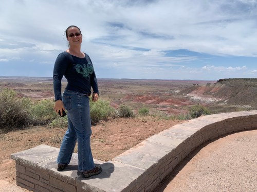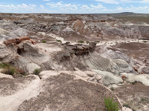 Yesterday, Jessica and I saw the lovely Petrified Forest National Park, painted dessert, and ancient petroglyphs in Arizona. Before going into the park, we shopped at Jim Gray’s Petrified Wood Company in nearby Holbrook to ensure we would not be tempted to pick up souvenirs. The store has fields of petrified wood, geodes, and minerals collected on private land. In the Park, we saw colorful badlands where the ancient stone logs were either on the open grass or eroding out of the ground.