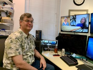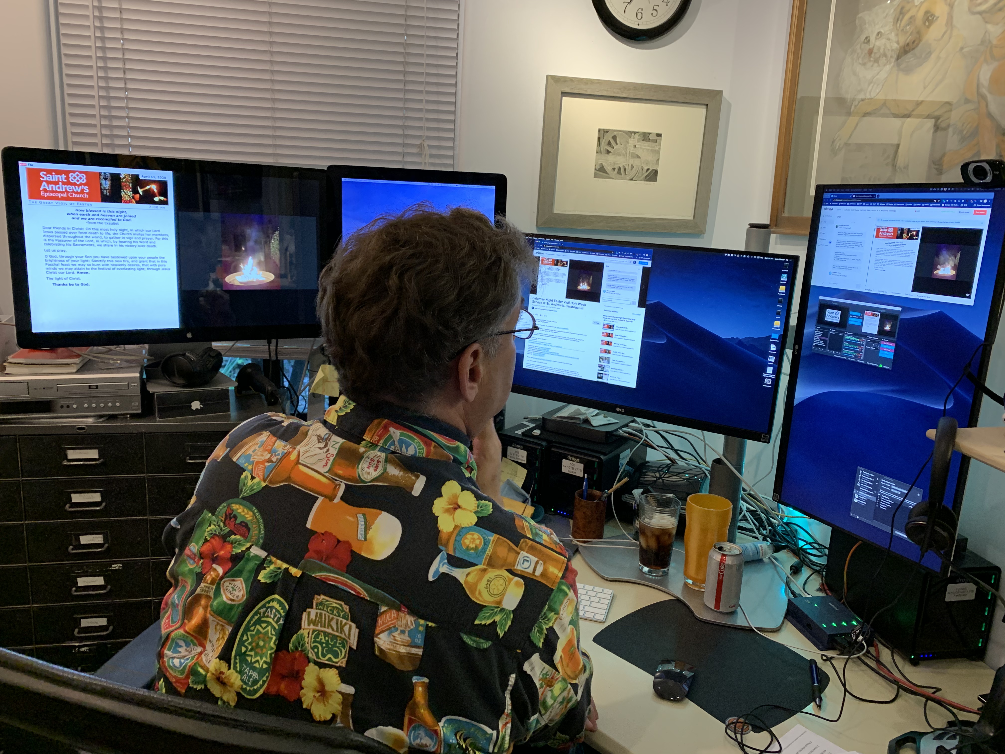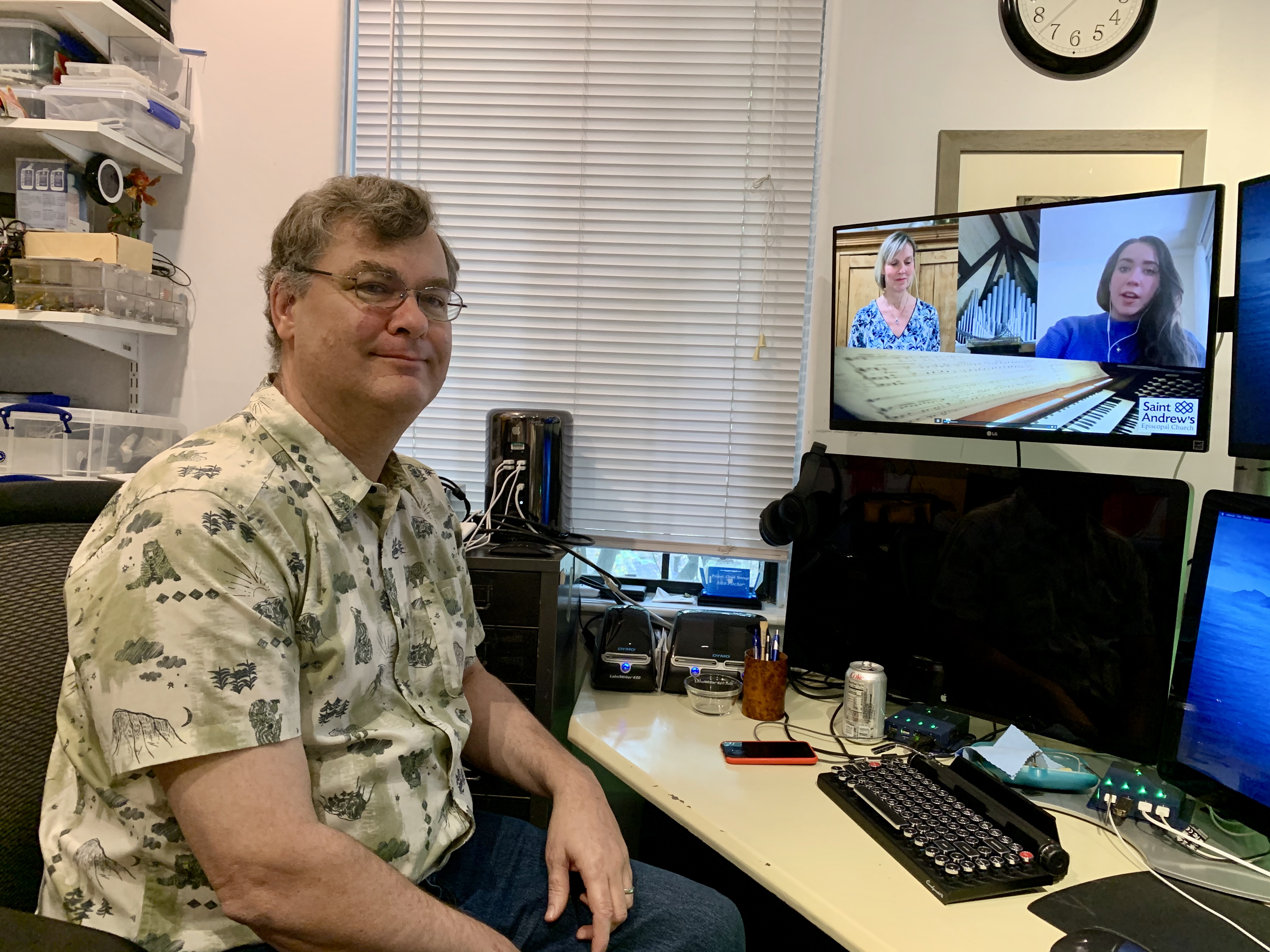 My husband John Plocher is not musical but during the COVID-19 quarantine, he has been helping others to sing. John has been recording and broadcasting our regular church services from the St. Andrew’s Episcopal Church choir loft for years (with backup from the talented teens of the Youth Group whom he has been mentoring). During the quarantine, John used the skills and equipment he had put together to help St. Andrew’s clergy shift into a weekly service online. Music has always been a huge part of our parish community life, so John has created online music with choir directors Leroy Kromm, and David Howard-Pitney, and the inspiring parish symphony and folk choirs, singers, and instrumentalists.