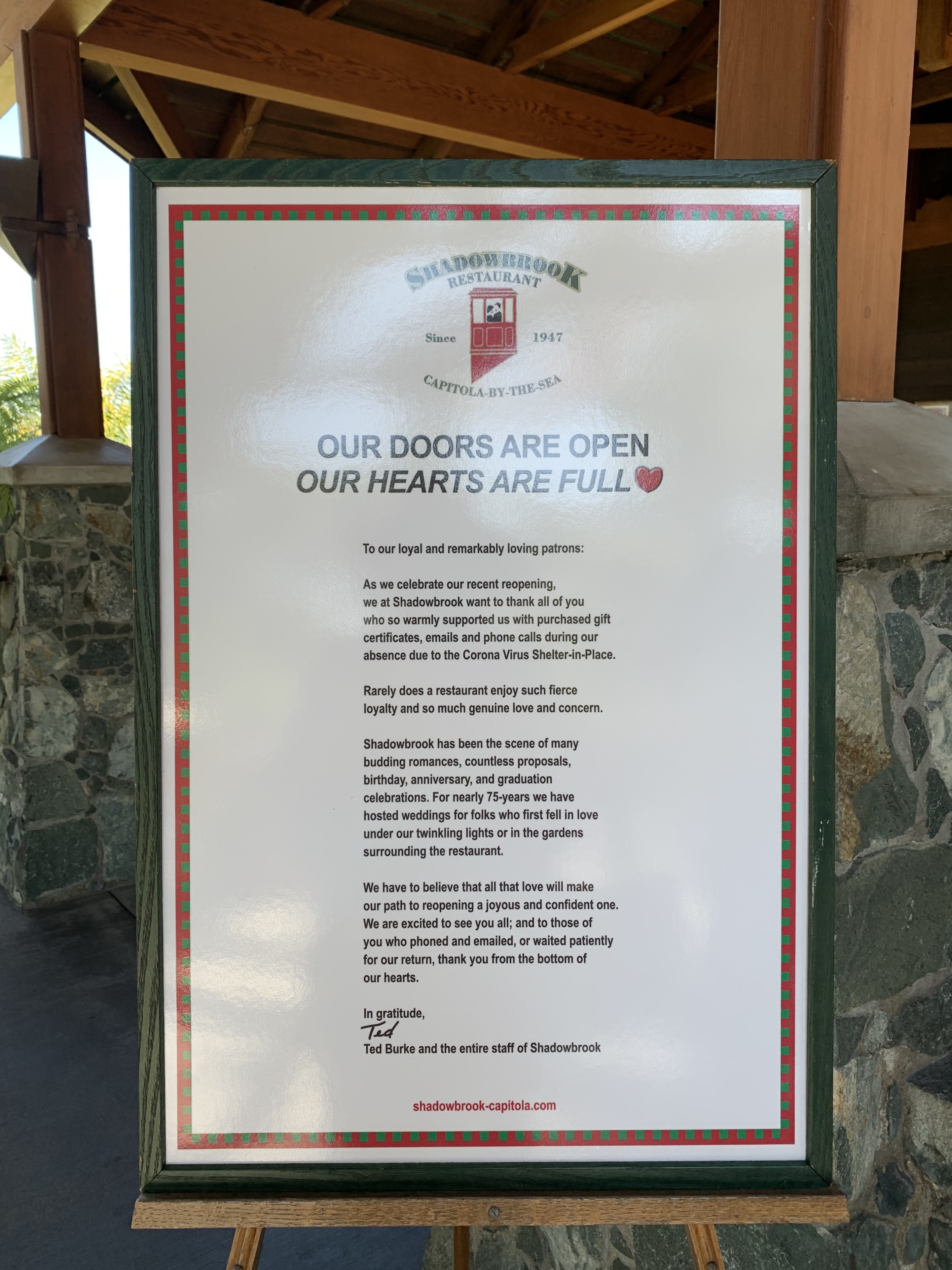 For our 20th wedding anniversary, John and I had planned to go on a fancy international trip; however, the Covid-19 lockdown prevented that. So, we spent last weekend on driving tour of the local Santa Cruz area instead. Traveling during a pandemic requires more planning, expense, and a willingness to be flexible and change your mind if circumstances do not feel safe. We stayed at Chaminade, a resort with a well-designed social distancing plan, including disinfecting and sealing rooms between guests. It is a pretty location with a great view but expensive (over $60 for breakfast for two, take out style in plastic containers on the deck). There were so many unmasked kids and parents running around we did not feel comfortable using the pool, and there was so much poison oak we did not feel comfortable using the trails. So, we went driving to find more secluded locations.