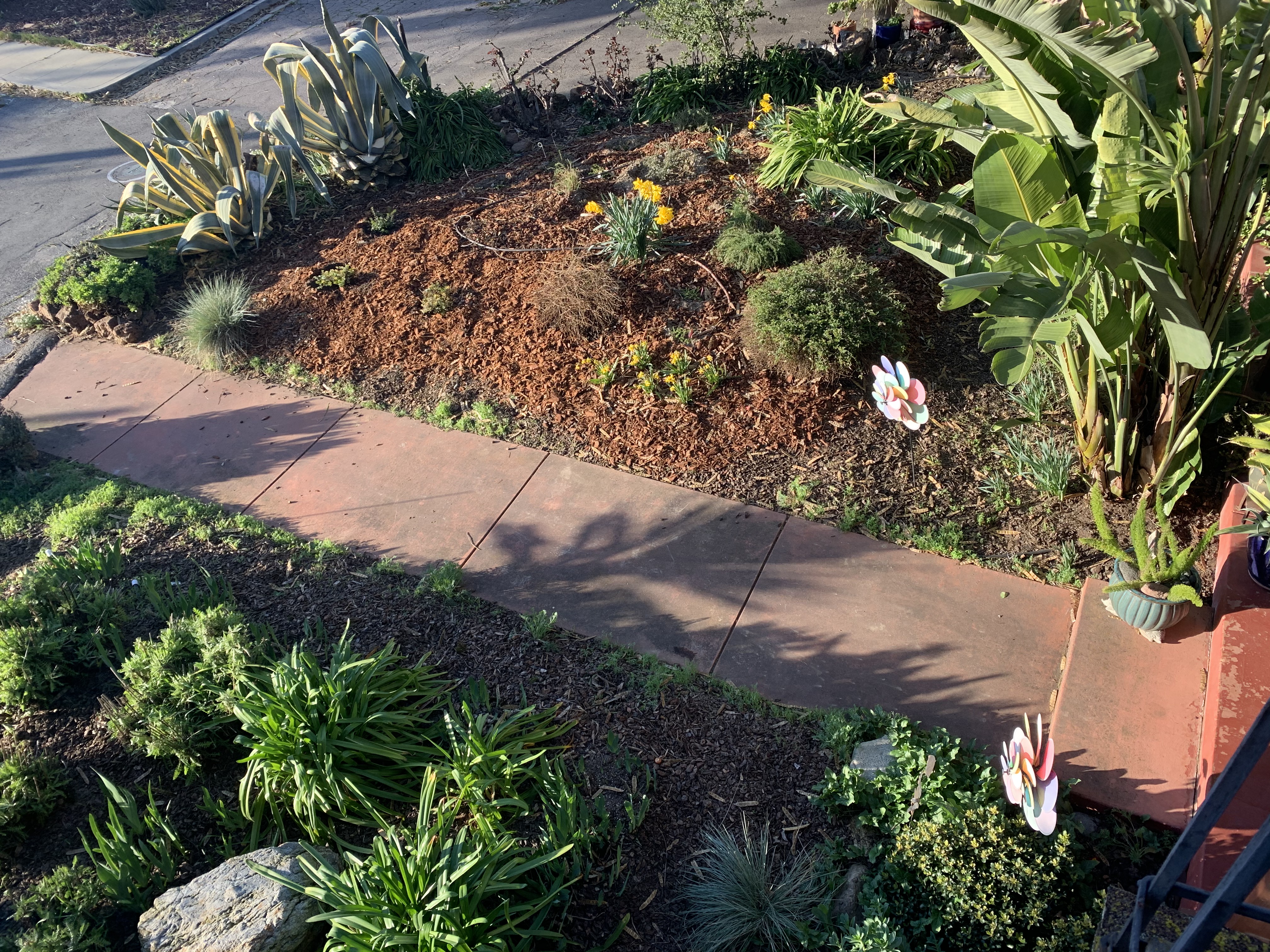 Five years ago, I redesigned our front garden for water conservation. Partly as a result of my recent experience with a Pacific School of Religion class project helping to plant a food garden for The Village curbside community, aka homeless encampment, in Oakland, I was inspired to replant some of my own garden in Willow Glen (San Jose, California). John Plocher and I had to reroute the watering lines. I also had to remove couch and Bermuda grass volunteers, and relocate the many big pink worms that get mixed up in the work.