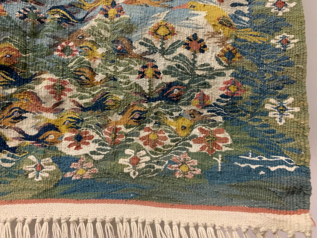 Our first Wissa Wassef tapestry is a small master work called “Around the Pond,” woven in cotton by Mohamed Achour in 2010. It presents fish and birds with palms and flowering plants around a small body of water.