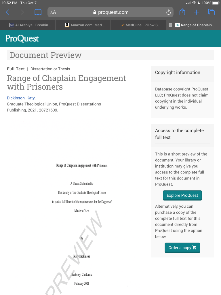 ProQuest has just published my Master’s thesis, “Range of Chaplain Engagement with Prisoners” – Hooray! I am still waiting for the 158 page document to appear in the Graduate Theological Union Library catalogue, which will be more easily referenced. I have been waiting since my thesis was signed off in February 2021 for the GTU and ProQuest to make my thesis available so I am very happy that this process is (mostly) complete.