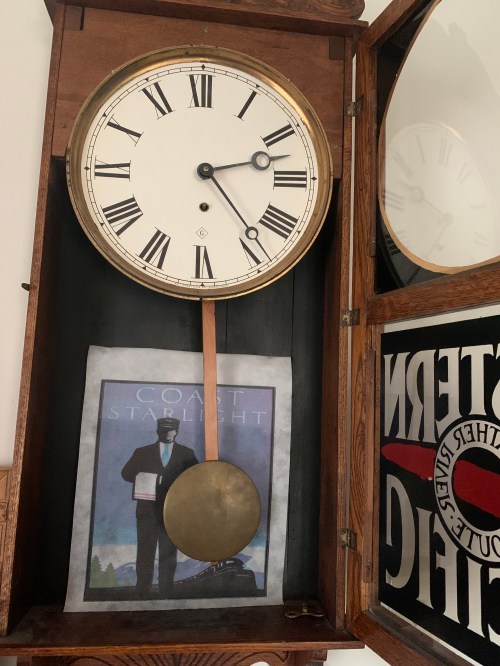 I bought the Gilbert wall clock in 2008 as a birthday present for John. The clock itself is from about 1915. The Western Pacific glass is not original but is one of the reasons we like it, since we own WP668, a Western Pacific caboose. John winds up his Junghans and Gilbert clocks every week.