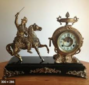 The two clocks which have stopped working are from my family. One is a gilt metal Rococo style clock that my father’s mother, Gladys Grace Oakes Dickinson, loved. The other is an ornate horseman clock that my mother, Eleanor Creekmore Dickinson, had since I was young. Surprisingly, even though they are from different parts of my family, both were made by the New Haven Clock Company, probably over a hundred years ago.
