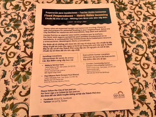 It’s that time of year: flood season on San Jose’s Guadalupe River. Late yesterday afternoon, yellow rain slicker clad city workers went house to house to tell us of immediate danger of flooding. In addition to the houses, city workers went to each of the homeless camps near us to be sure that our unhoused neighbors were also prepared. Because of the COVID-19 pandemic, there are many homeless living under bridges and in culverts near the river where they are in danger as the water rises. We are watching the water levels on the NOAA map.
