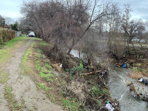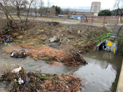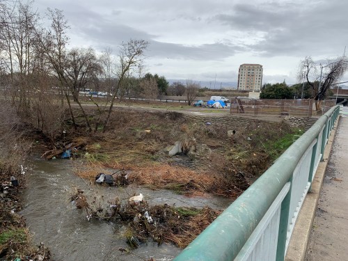 San Jose’s Guadalupe River, Alma bridge, with homeless camps.