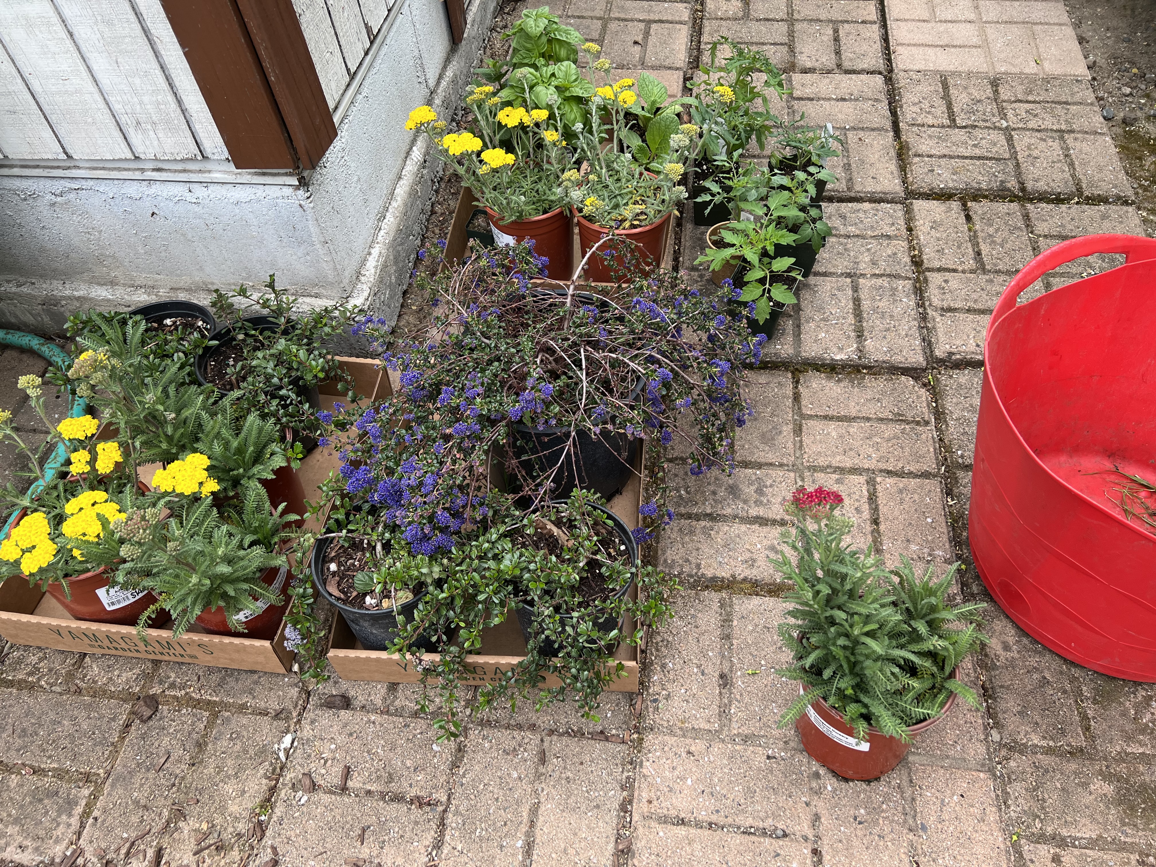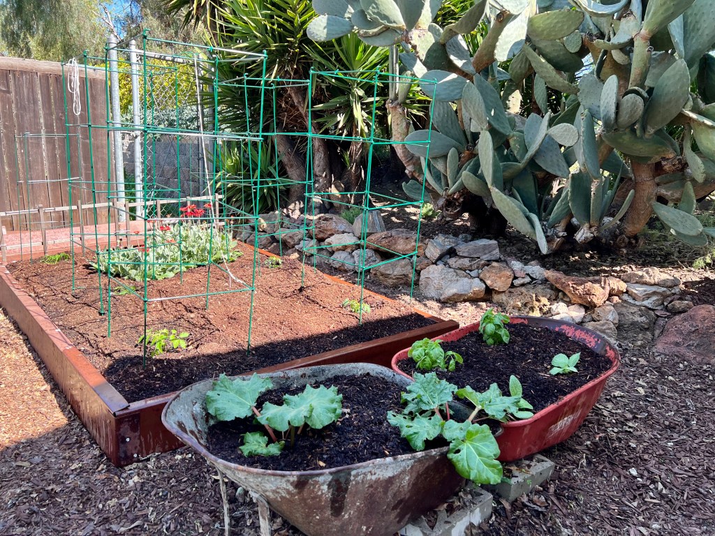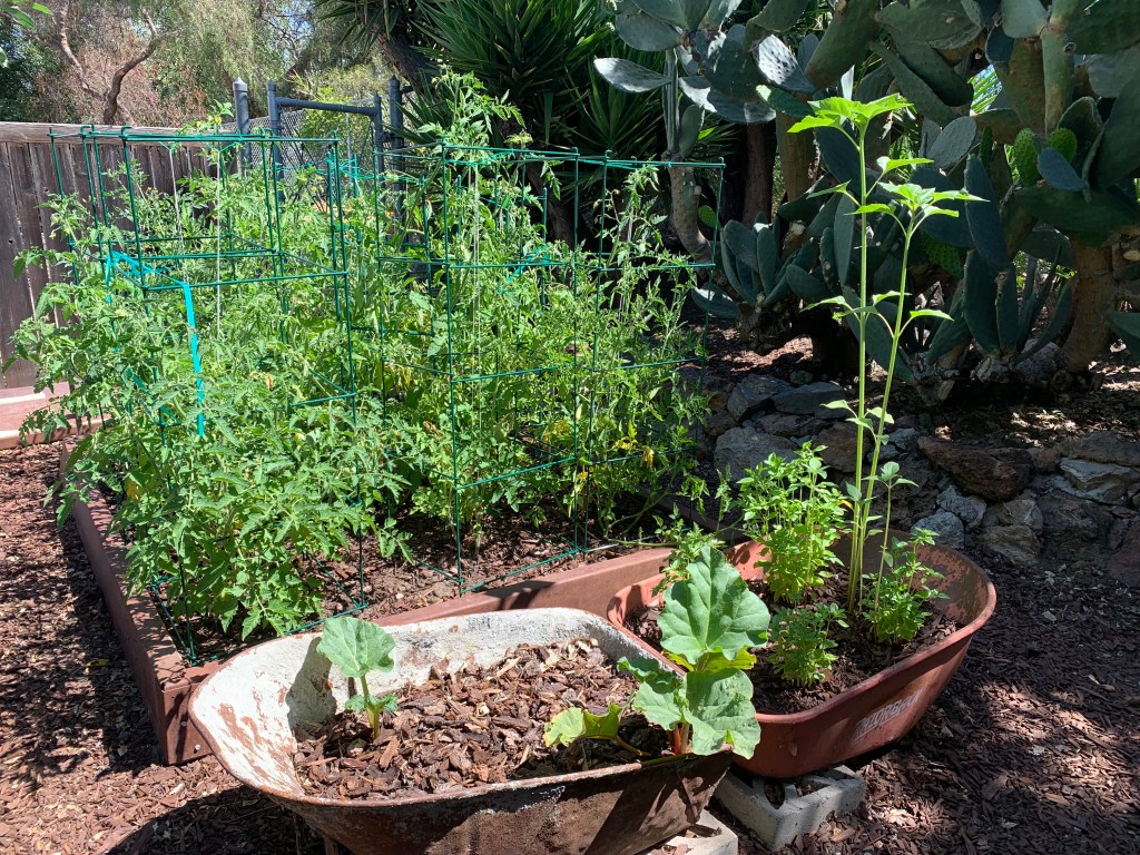 It’s time in the San Francisco Bay Area to start planting our summer vegetables. Since I have some time during GTU‘s Reading Week, I cleared out winter weeds, dug in compost, and added tomatoes, basil, and borage to my planting beds. I left the rhubarb in its wheelbarrow since it seems happy. This year, from Yamagami’s nursery I bought three cherry tomato plants for salads and snacks (Yellow Pear, Sun Sugar Hybrid, and Super Sweet 100), plus three Ace tomatoes for soup. I also upgraded the Guadalupe River bank area next to the planting bed. The big yuccas, huge prickly pear cactus, and an elderberry tree dominate that space. There are also three lavenders (French and English) and two California Sagebrush (Artemisia Californica – from Jessica) continuing from two years ago. I just added four gloriosus “Heart’s Desire” prostrate ceanothus to fill in under and around the cactus. Another ceanothus “Centennial” plus some yarrow (Achillea Little Moonshine, and Red Velvet) will go in the front yard. I mostly add California Native Plants for long-term plantings. I am looking forward to everything growing happily all summer!