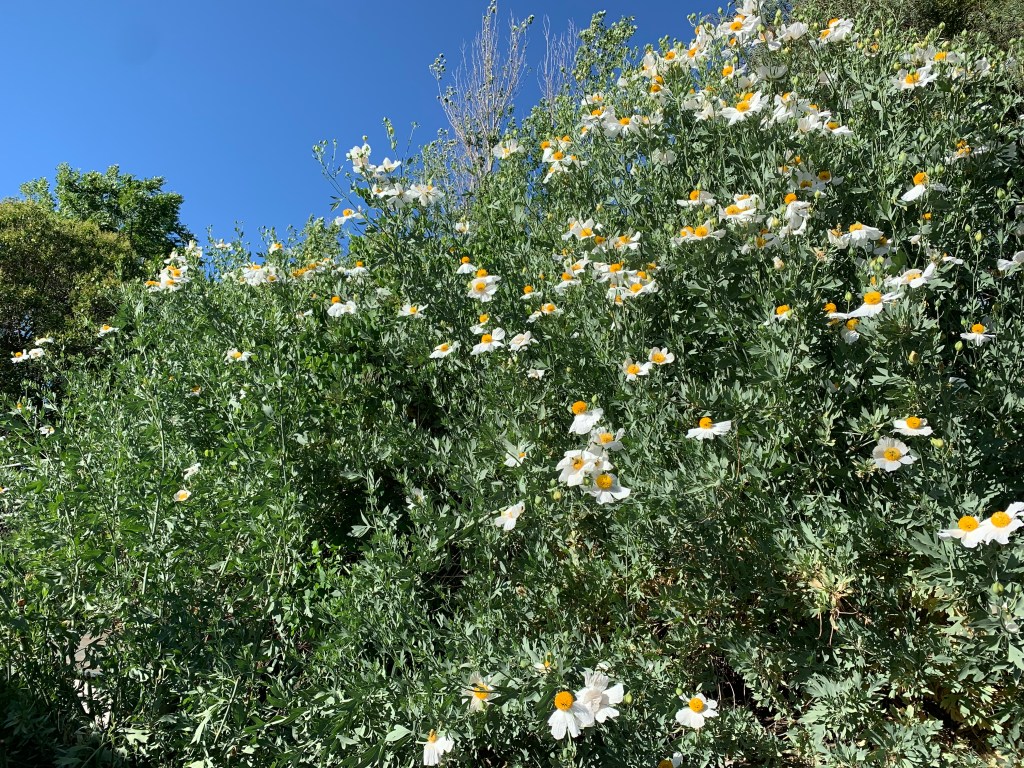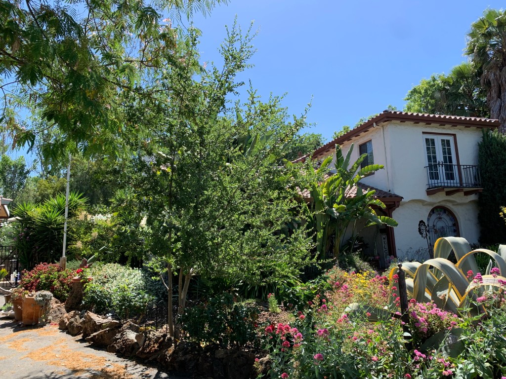 Now that I am done with Spring 2021 classes, I have been able to tend my garden. Our house in Willow Glen (San Jose, California) was built almost 100 years ago in the old bed of the Guadalupe River, so the soil is amazing. Yesterday, we planted a green-bark, yellow-flower Palo Verde tree (Desert Palo Verde – Cercidium floridum – Parkinsonia Florida), that should thrive in our increasingly-hot summers. The tomato garden I planted in March is starting to fruit, and the giant white bird of paradise (Strelitzia nicolai), Pink Stripe Flax (Phormium), Matilija Poppies (Romneya), and four types of yarrow are blooming exuberantly. The oak tree named after my friend Seham Aljaafreh, who helped me plant it in 2014, has doubled in size this year.