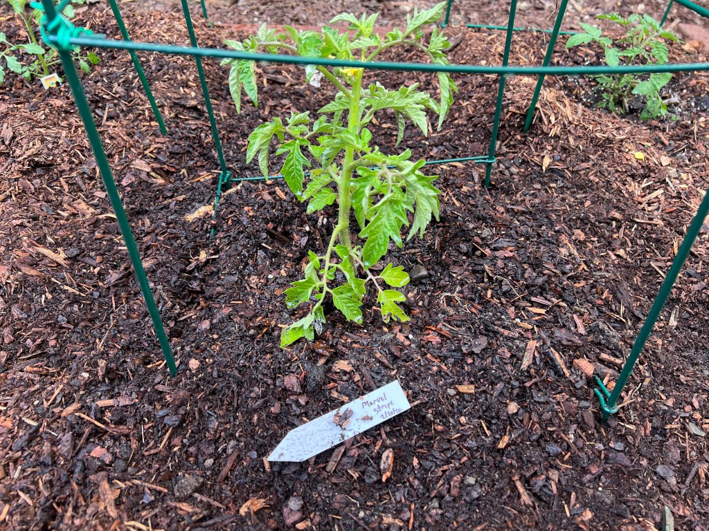 Update 28 March: My neighbor Russell gave away some of his extra heirloom tomato starts today – so I added a seventh (and final!) plant to my bed. The little plants are enjoying today’s rain.