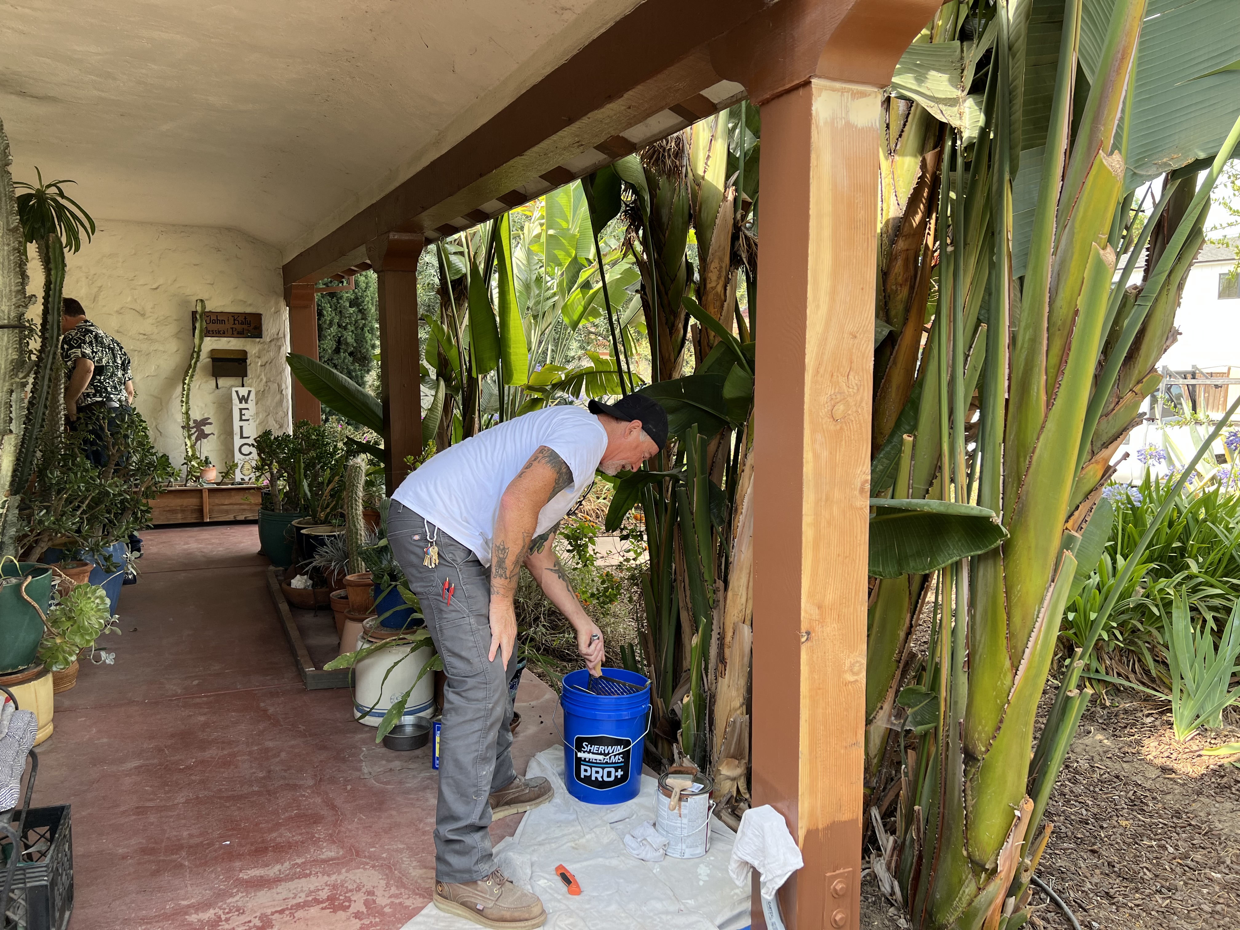 Porch post with gap, July 2022Original side walkway, July 2022John Plocher raking weeds, July 2022Resetting porch tiles, July 2022Repaired side porch tiles, July 2022Cat judging front porch construction, July 2022Digging french drain trenches, July 2022French drain trench complete, July 2022French drain lining and rock, July 2022Completed french drains, July 2022Painting new porch post, July 2022Pouring new side ramp, July 2022Smoothing new ramp, July 2022New ramp walkway, July 2022FaceTime of work under house, July 2022End of walkway drying, July 2022Fixing front door, July 2022Princess the cat hiding, July 2022
