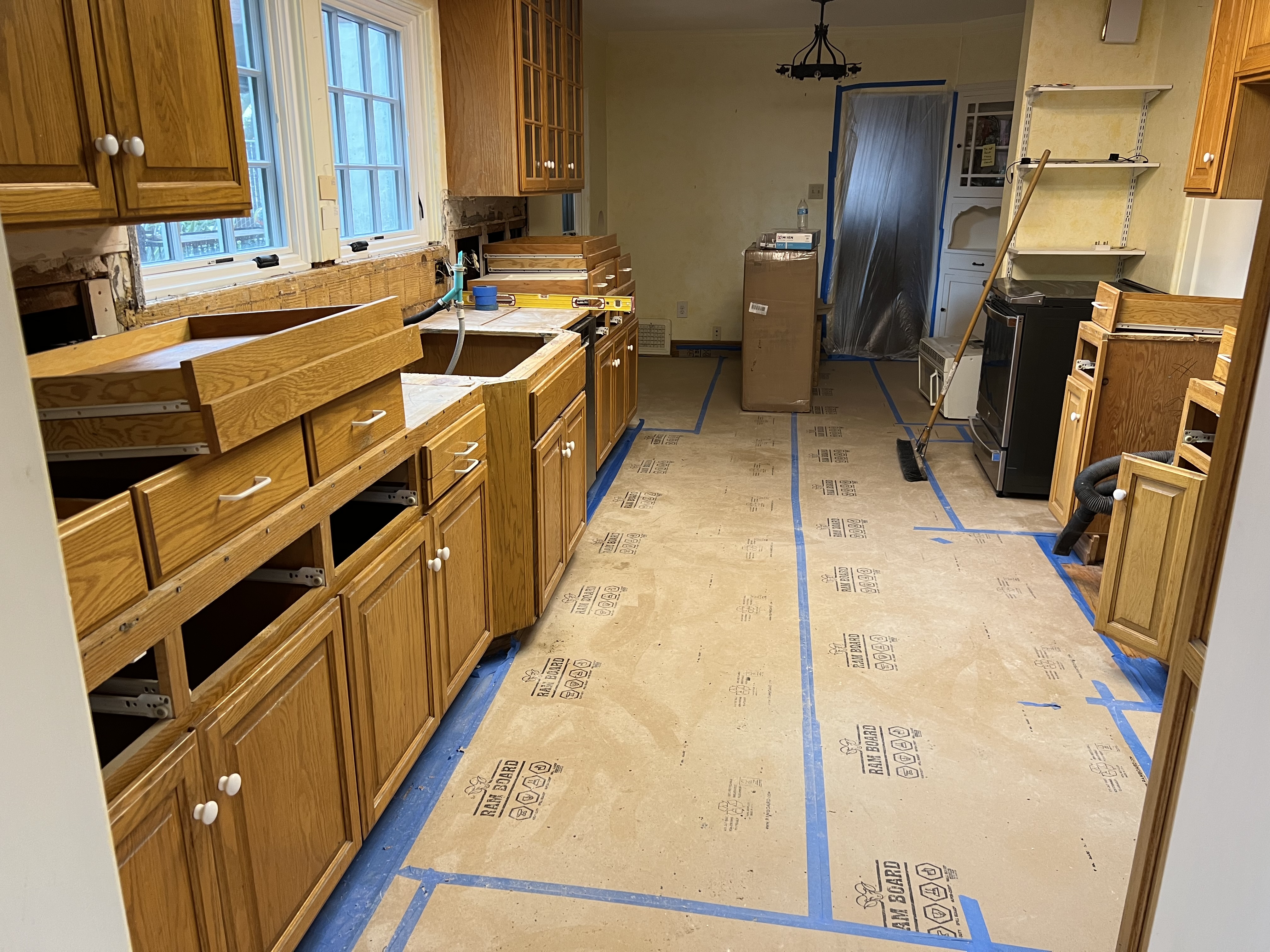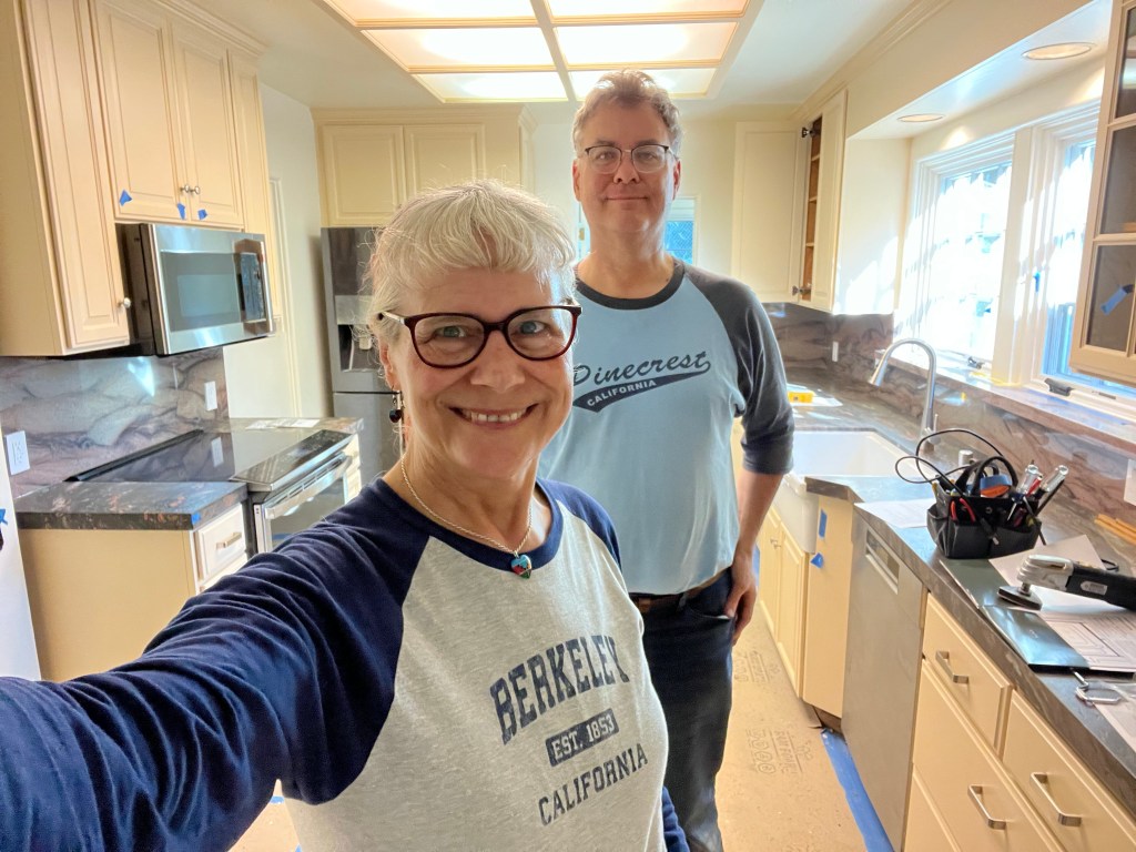 It feels like camping out in our own home. John is patient with the temporary kitchenette we created in his office. (This is overseen by the Moltres Pokemon mural my mother Eleanor Dickinson and son Paul painted when that was his bedroom.) We are doing dishes in the bathroom. My birds are confused by their extended field trip to the dining room, where their cage is surrounded by boxes of china and kitchen stuff. The contractor came by this morning to say that the countertops will be installed tomorrow, and the cabinets and paint will be finished next week. Here’s hoping for that to happen as scheduled!
