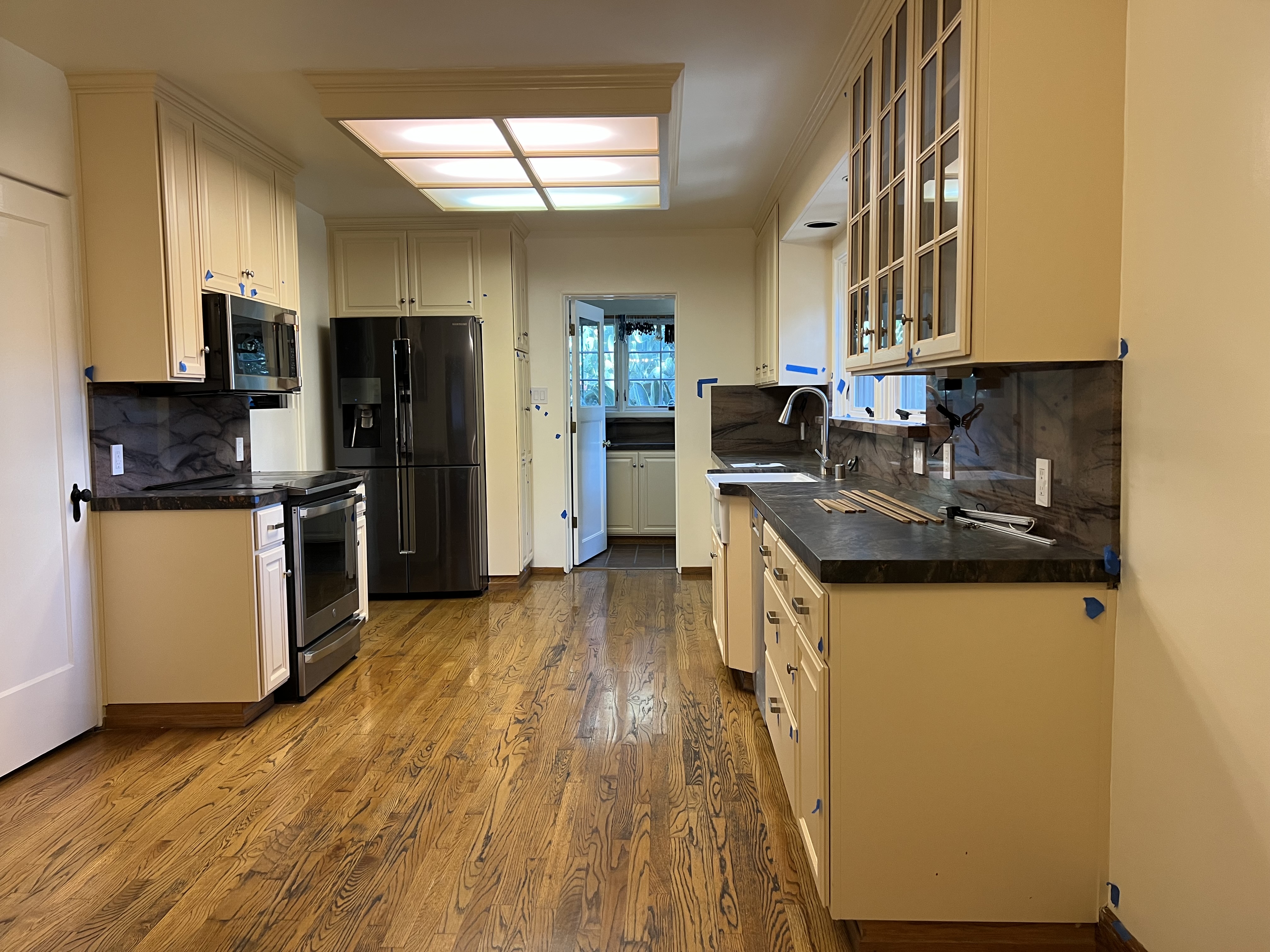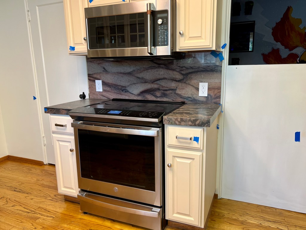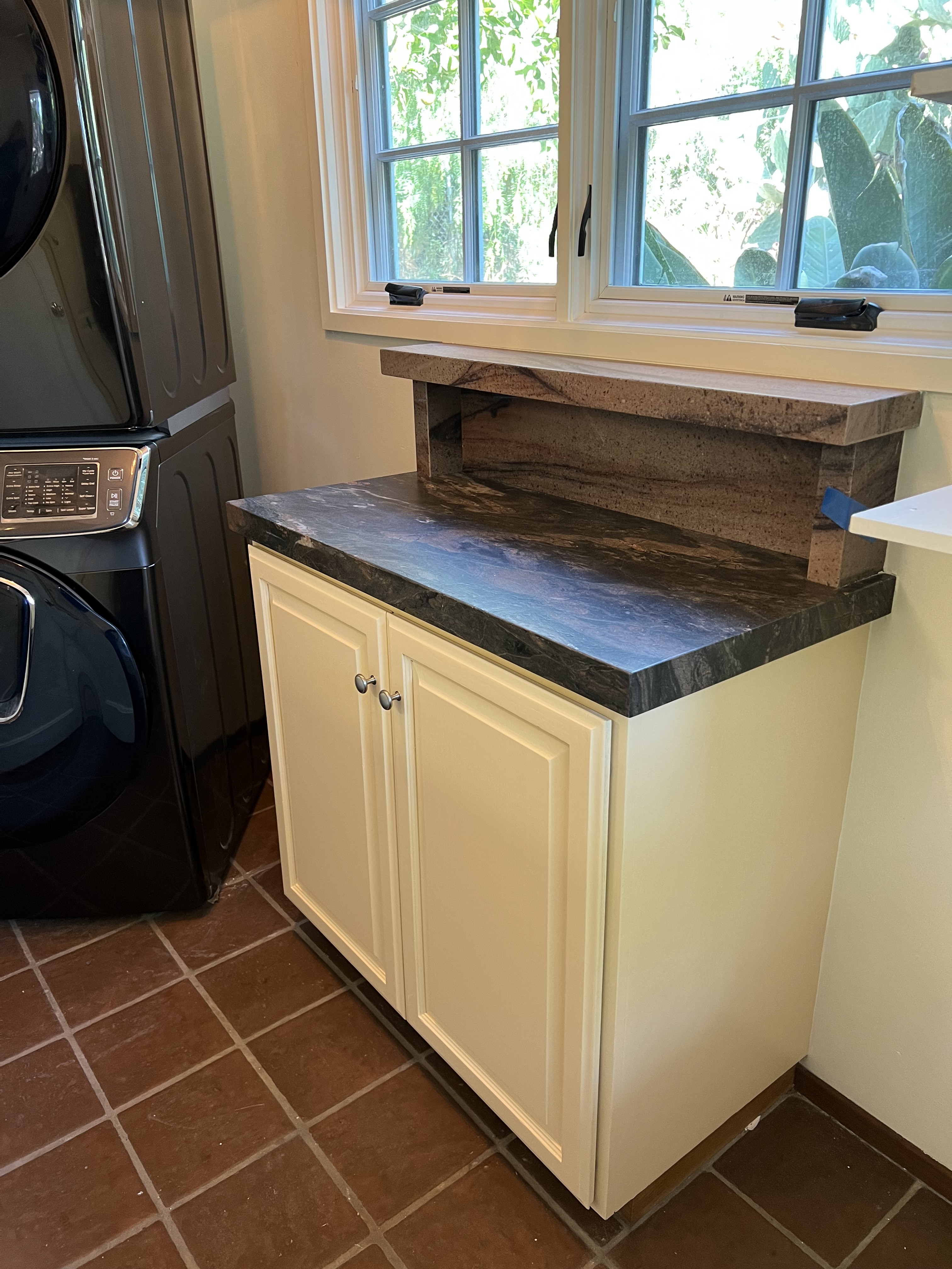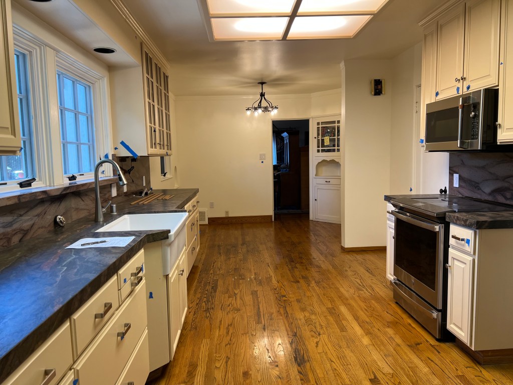 Our kitchen remodel today reached the “done enough” stage. I like our updated kitchen and want to start using it. I am glad to see the newly-uncovered oak floors go well with the fresh paint and granite counter and backspash. Lots of little stuff still to do (fixing many paint errors-and-omissions, installing under-cabinet lights, replacing shelves, replacing a sliced window screen, replacing the cabinet muntins…). All the little blue bits of tape in the pictures are where the paint is messed up. However, at this point, we would rather finish that work ourselves. We ran all of the plumbing and appliances last night and found two leaks, but those were fixed today. Some of the work was very well done, especially the cabinet upgrades, and the stone work. I love how the granite pattern behind the stove looks like sand dunes, and how the book matched granite patterns flow into each other. I also like having shelves under the windows. Still, I am happy to have the contractors out of the house. I am also happy to be able to use my new super-fancy laundry folding counter. I figure I spend so much time standing there, I should enjoy how it looks. Our house is almost 100 years old and I expect this kitchen to serve it well into its next century.