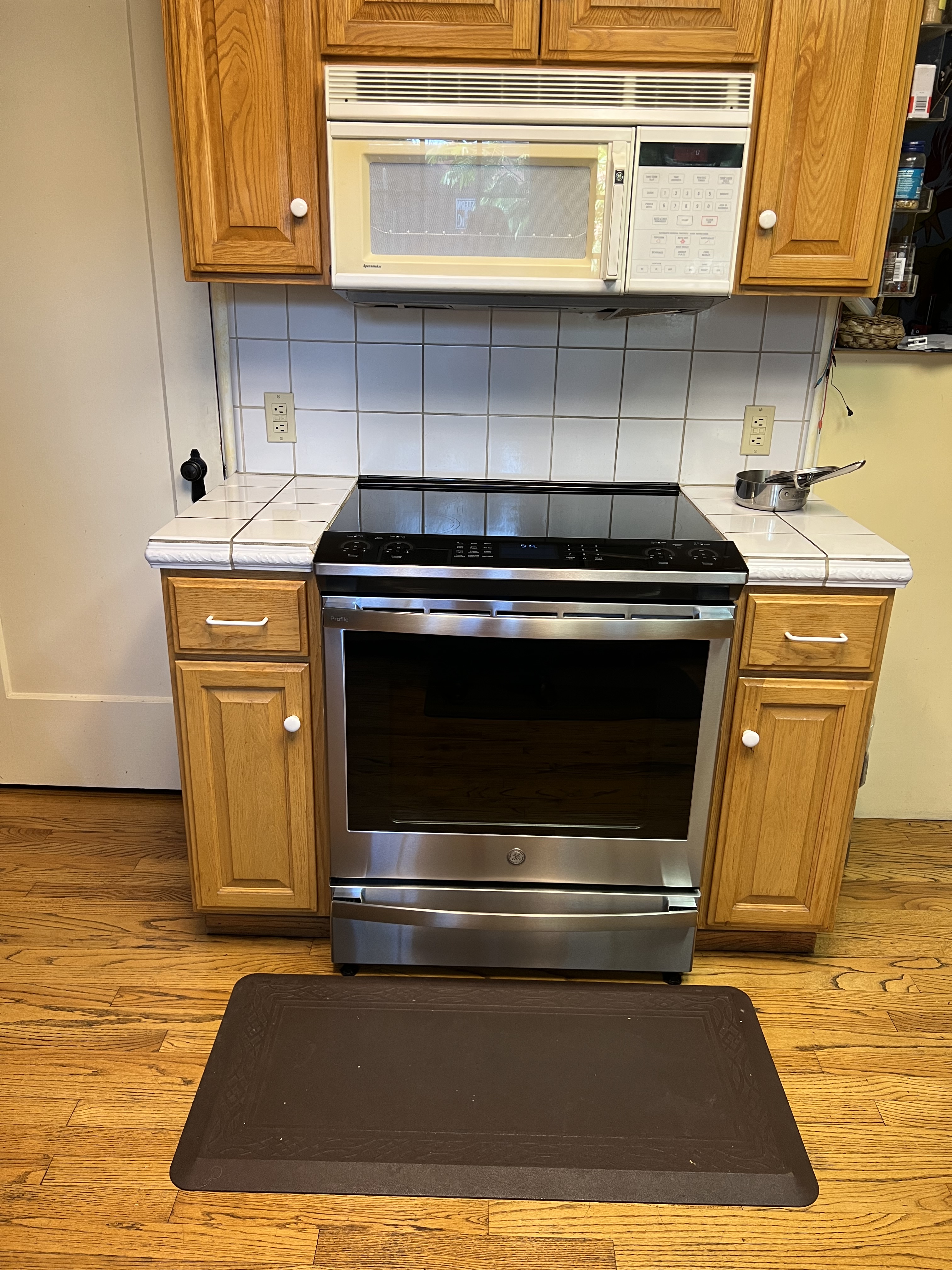 We are keeping the original cabinets because they are solid oak and, while after so many years the finish is trashed, they are good quality, fit well, and are in the right places. We are replacing the pulls, hinges, and drawer slides, so that means rebuilding the drawer boxes. We are also changing two under-cabinet doors to be drawers. The update is limited to those cabinet changes, granite counters to replace the nasty cheap tile, a new sink and faucet, cabinet and wall paint, electrical plug upgrades, and three new appliances: induction range / stove, microwave, and sink disposal. The induction stove meant we also had to buy all new pans. There has been much discussion over microwave placement. John (the fancy cook) says he prefers it over the stove, so we bought a new microwave unit with a built-in hood.