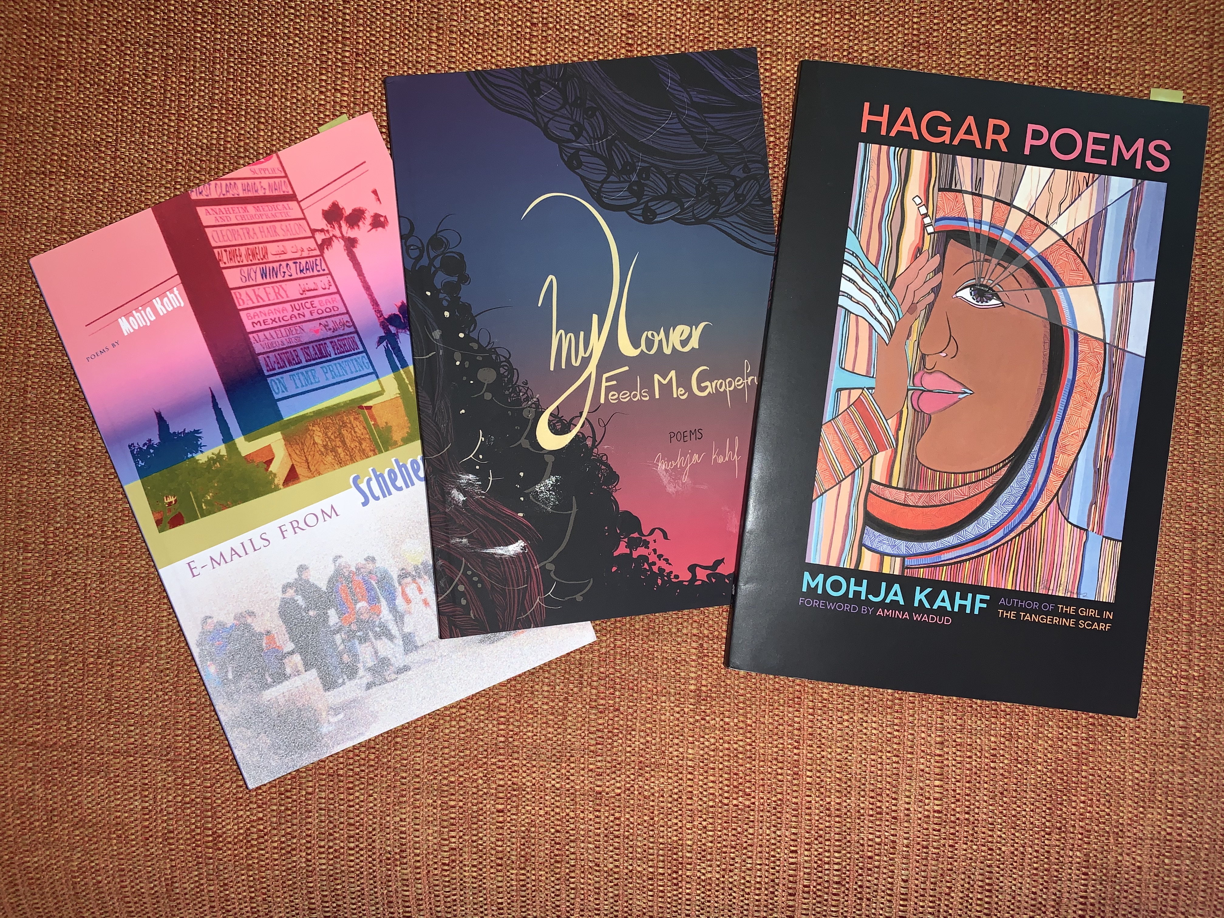 I recommend to you the poems of Dr. Mohja Kahf, whom you may know as the author of “My Grandmother Washes Her Feet in the Sink of the Bathroom at Sears.” Poet and scholar Mohja Kahf was born in Damascus, Syria. Her family moved to the United States in 1971, and Kahf grew up in the Midwest. She earned a PhD in comparative literature from Rutgers University. Her remarkable poetry books are:
