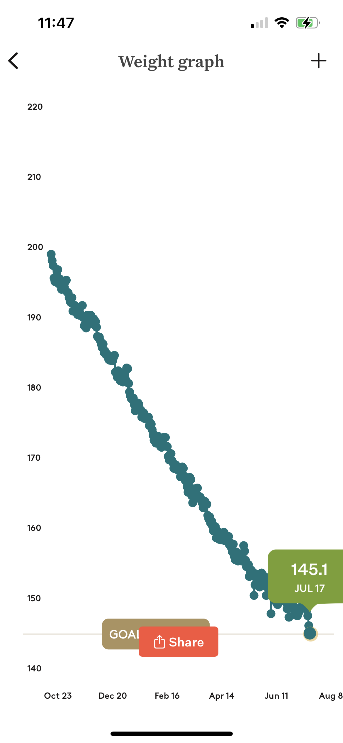 Katy Dickinson, 11 Oct 2021-17 July 2022 Noom Weight Graph